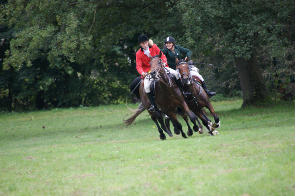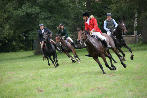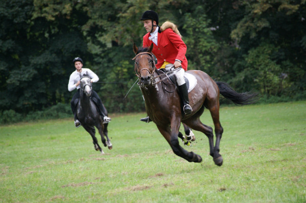 Następnie odbyła się odprawa jeźdźców. Starym zwyczajem uczestnicy pogoni wypili „strzemiennego” i udali się w teren rozprężyć konie, po czym odbył się bieg myśliwski.
